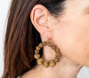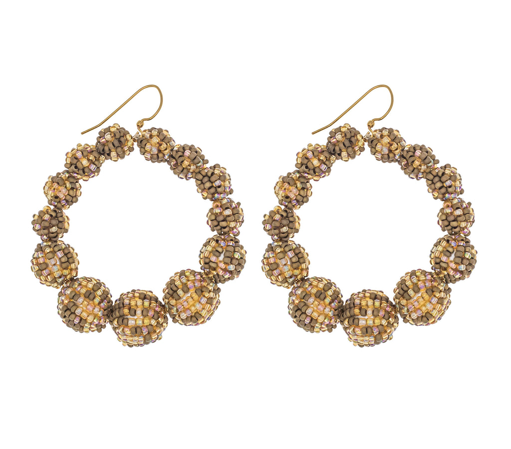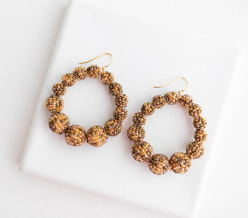 Ethically crafted beaded balls made of glass beads over a faux pearl threaded onto a brass hoop.
