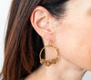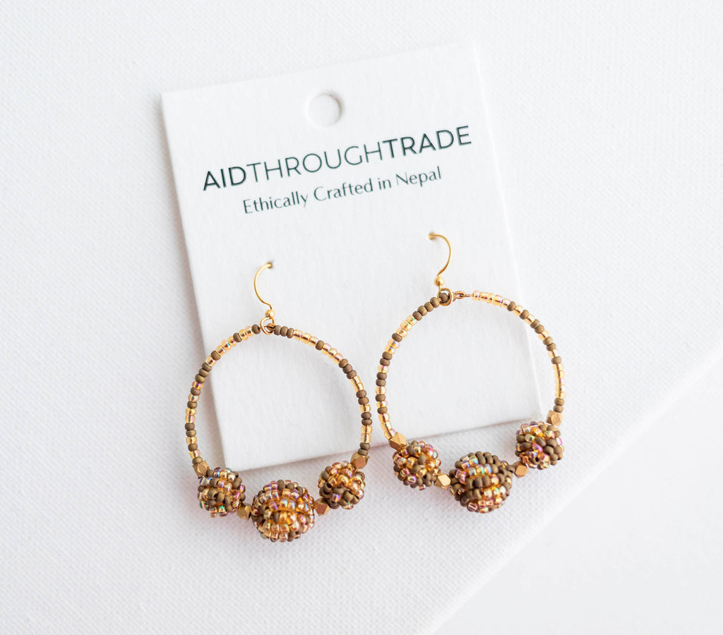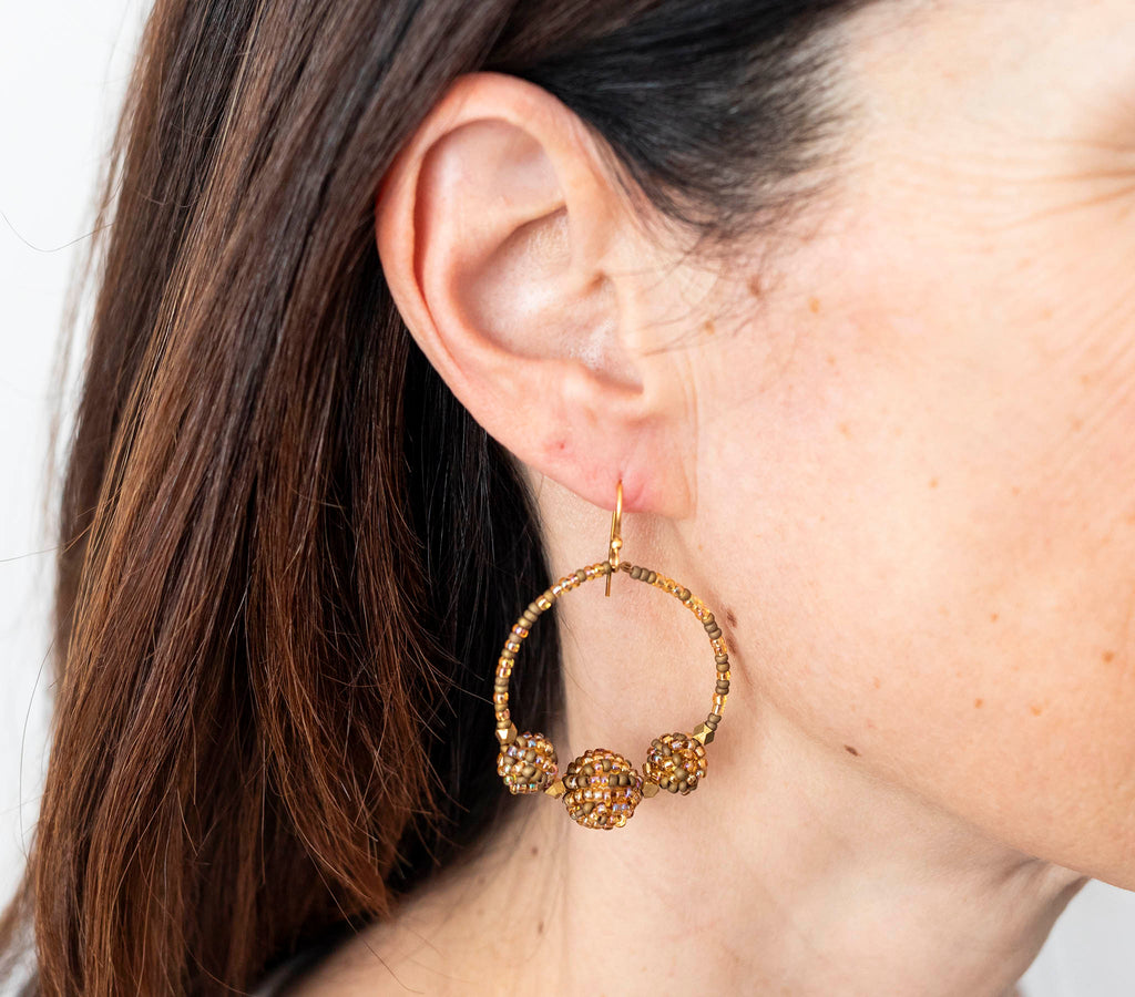 Ethically crafted beaded balls threaded over faux pearls, added onto a brass hoop.