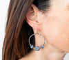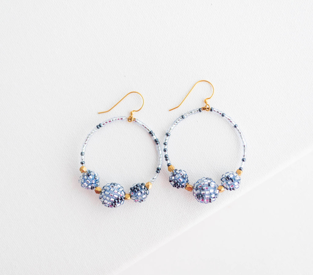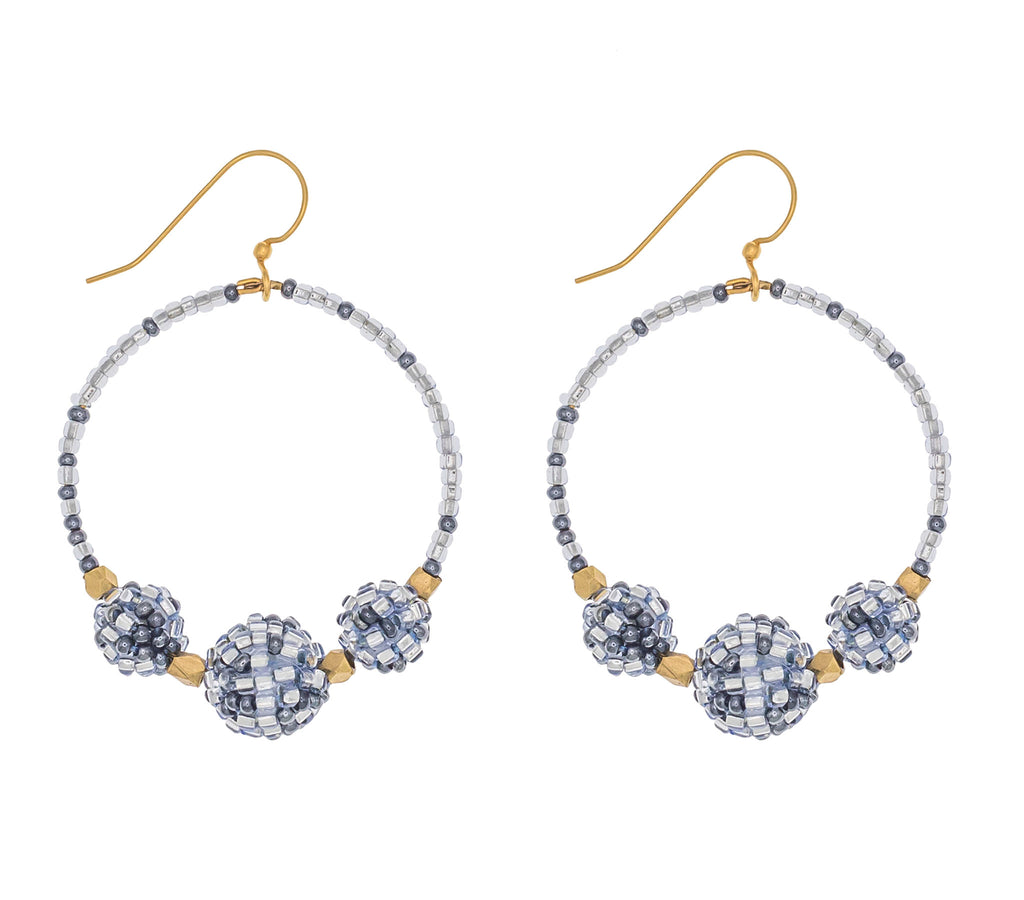 Ethically crafted beaded balls threaded over faux pearls, added onto a brass hoop.