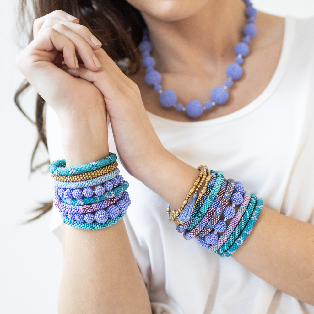 All of our designs come from the minds of our talented designers and production team and are inspired by our frequent travels to Nepal. Our design team works closely with our artisans throughout the entire design process, carefully considering the practical implications of our designs before moving forward with any production. We supply our artisans with only the finest quality glass beads from sources in the Czech Republic and Japan. Our vibrant, high quality beads and hand-dyed cotton thread combine to create the exclusive Aid Through Trade Original Roll-On® Bracelet, which carries a lifetime guarantee and fits almost any size wrist.